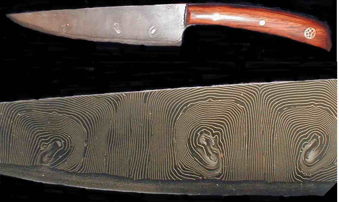 | This is a san-mai (Damascus sandwich) construction. The core is O1 and the Damascus is a jelly-roll of pure nickel and L6. It is known as 'Fingerprint' |