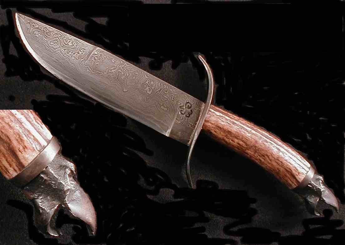 | This is a random-pattern damascus blades with mild steel, hot blue guards. The pommel is a forged eagle head usable as a bottle opener (but watch your fingers!). It has an O1 tool steel strip welded onto the body as a cutting edge. The damascus steel used in these knives is composed approximately 500 layers of 01,L6, and 5160 tool steels, 203E mild steel and wrought iron with a total carbon content in excess of 70 points. The head-treatment consisted of a triple heat-cycle followed by a banite (molten salt at 475F) quench and tempering at 350F. The spines and ricassos have been flame-softened. |