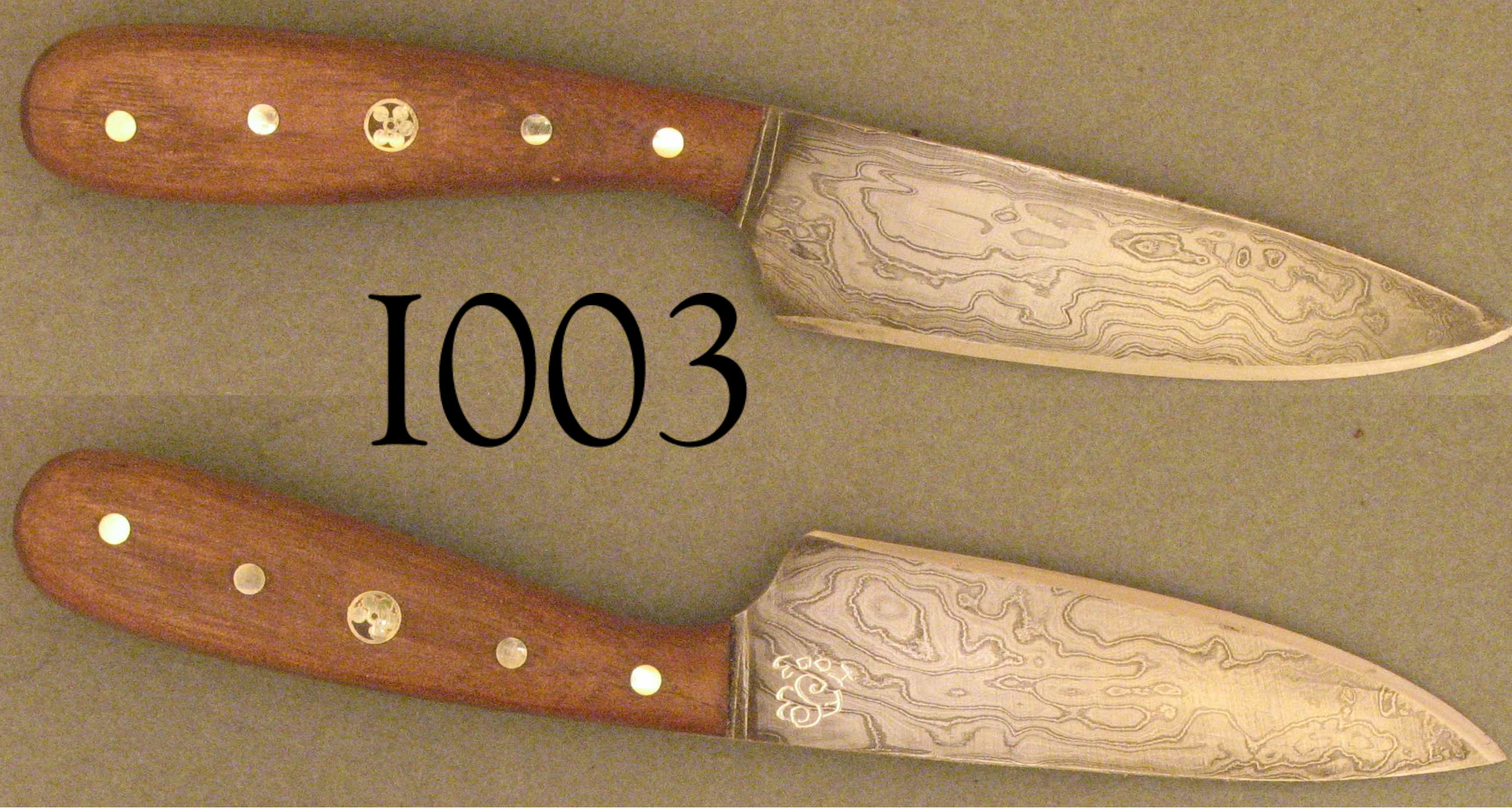 | Blade Characteristics Steel Type: Damascus Composition  : O1/L6/5160/203E/WI Billet #  : 9-Dec Number of Layers: 544 Pattern: Random Etch: Medium Polish: 600-1200 Dimension (inches) Length: 3.48 Max Thickness: 0.131 Min Thickness: 0.048 |