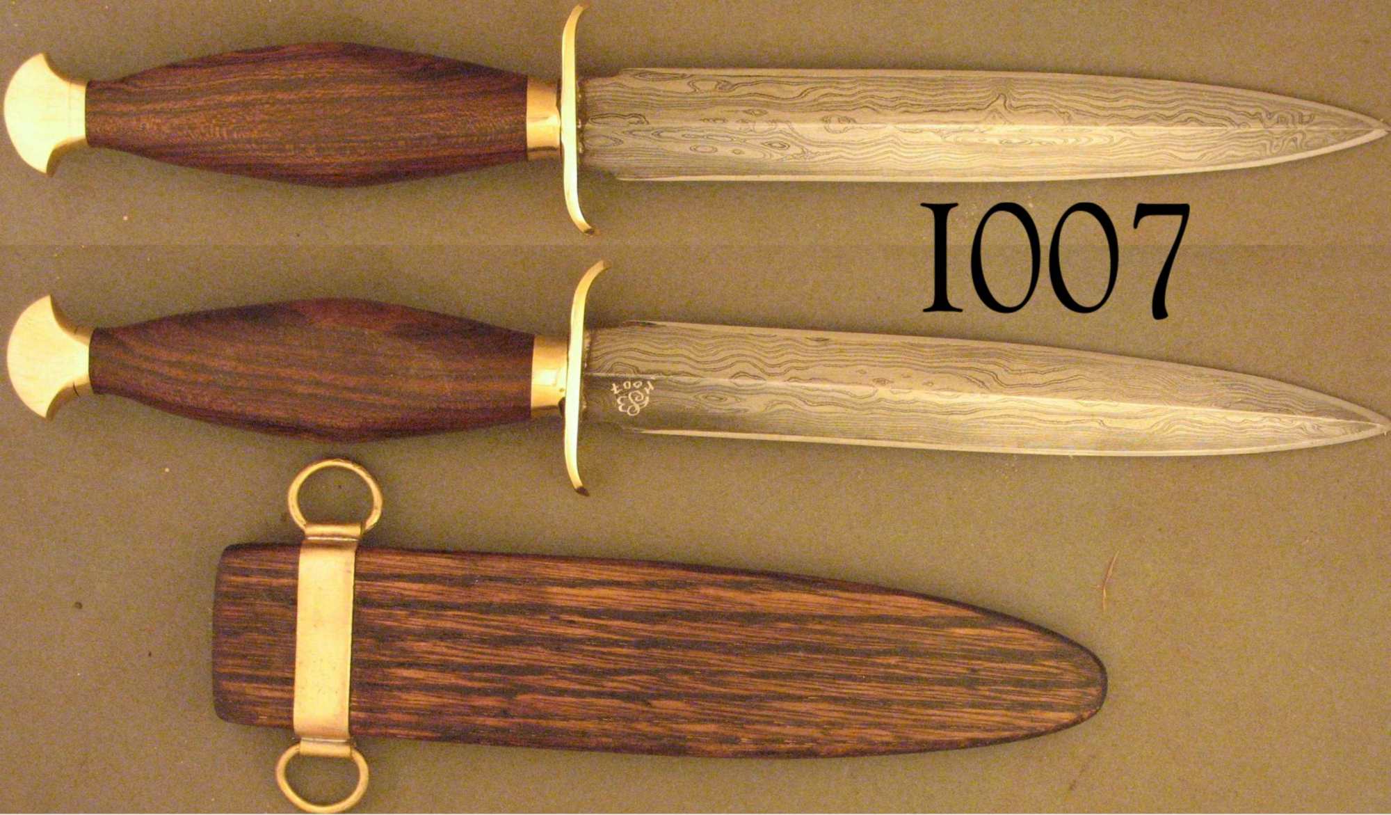 | Sheath is read oak stained to match handle. Balance is at the guard. Handle is short but fan-tail finial locks the dagger into even a big hand. 300 107 |