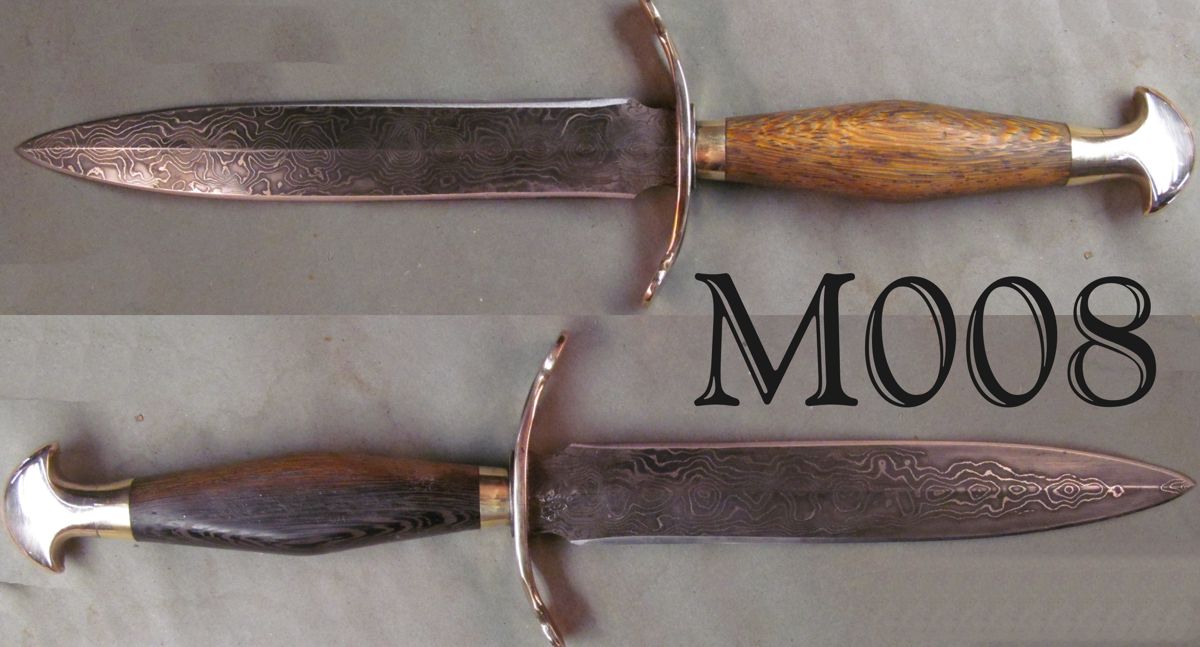 | Blade Characteristics Steel Type: Damascus Composition  : 1095/nickel with O1 core Billet #  : 2012 Number of Layers: ~100 Pattern: Ladder Etch: Medium Polish: Satin Dimension (inches) Length: 8.5 Max Thickness: 0.2 Min Thickness: 0.075 |