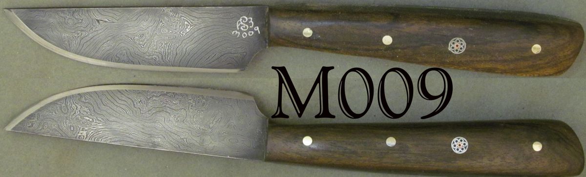 | San-mai with O1 core & CW twist on one side &CCw twist on the other. Twin to M010. Sold |