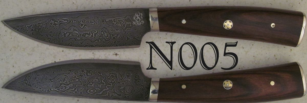 | Blade Characteristics Steel Type: Damascus Composition  : O1/L6 Billet #  : N002 Number of Layers: 270 Pattern: Dolly Parton Etch: Medium Polish: Satin Dimension (inches) Length: 4.7 Max Thickness: 0.177 Min Thickness: 0.078 |