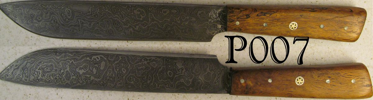 | Blade Characteristics Steel Type: Damascus Composition  : O1/L6//203E/52100 Billet #  : Oh01 Number of Layers: 312 Pattern: Dolly Parton & Earth Mother Etch: Medium Polish: Satin Dimension (inches) Length: 8.0 Max Thickness: 0.163 Min Thickness: 0.1 |