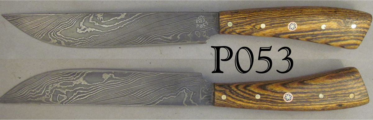 | Blade Characteristics Steel Type: Damascus Composition  : O1/L6 Billet #  : P08 Number of Layers: 156 Pattern: Twist Etch: Medium Polish: Satin Dimension (inches) Length: 6.1 Max Thickness: 0.082 Min Thickness: 0.054 |