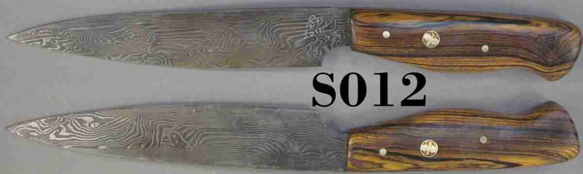 | Blade Characteristics Steel Type: Damascus Composition  : O1/L6 Billet #  : S01 Number of Layers: 204 Pattern: Dolly Parton Etch: Medium Polish: Satin Dimension (inches) Length: 6.5 Max Thickness: 0.11 Min Thickness: 0.048 |