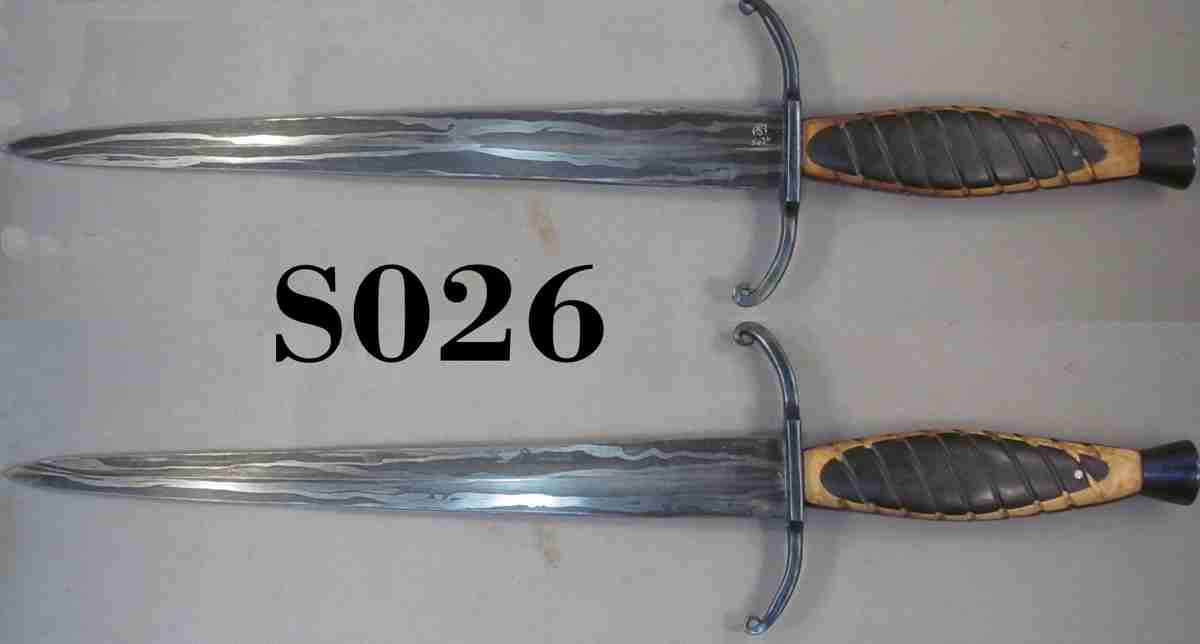 | Blade was a honey-comb of L6 (0.07 x 1" x ~2.5") + 1084 powder. The 'squares' were ~0.75" square and have been highly stretched by the welding and forging. Guard & pommel are mild steel hot blued and the blade can be dismantled. Sheath can be removed from the hanger and both are hand-sewed and treated with Snow-Seal (TM) |